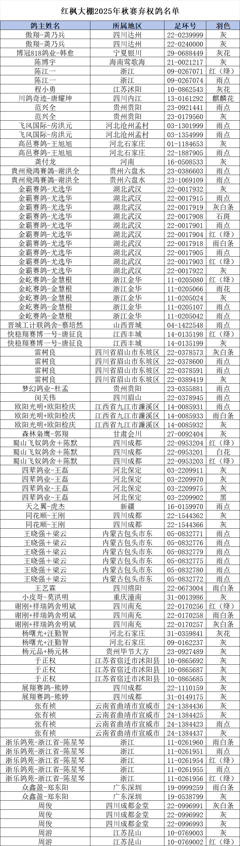 \ 红枫大棚:2025年秋赛弃权鸽名单